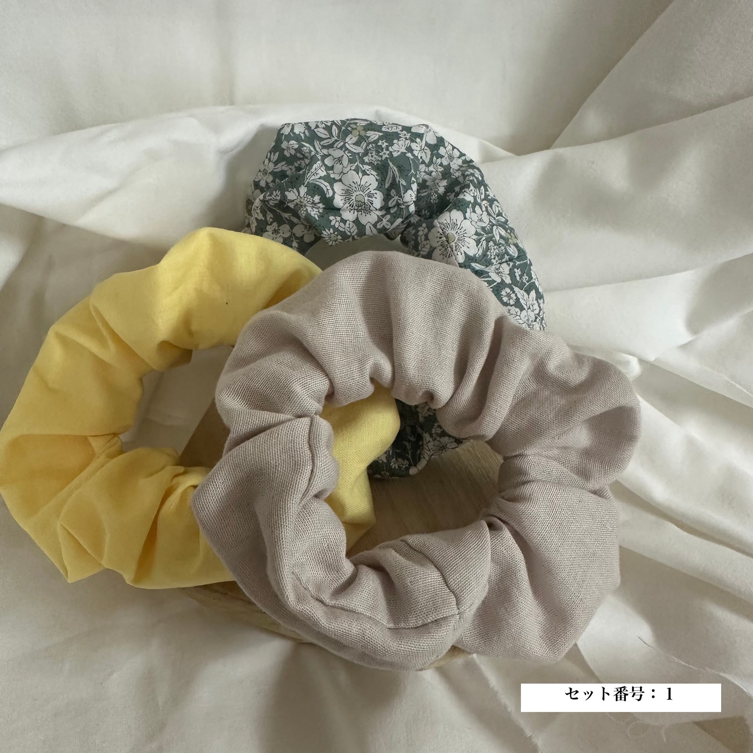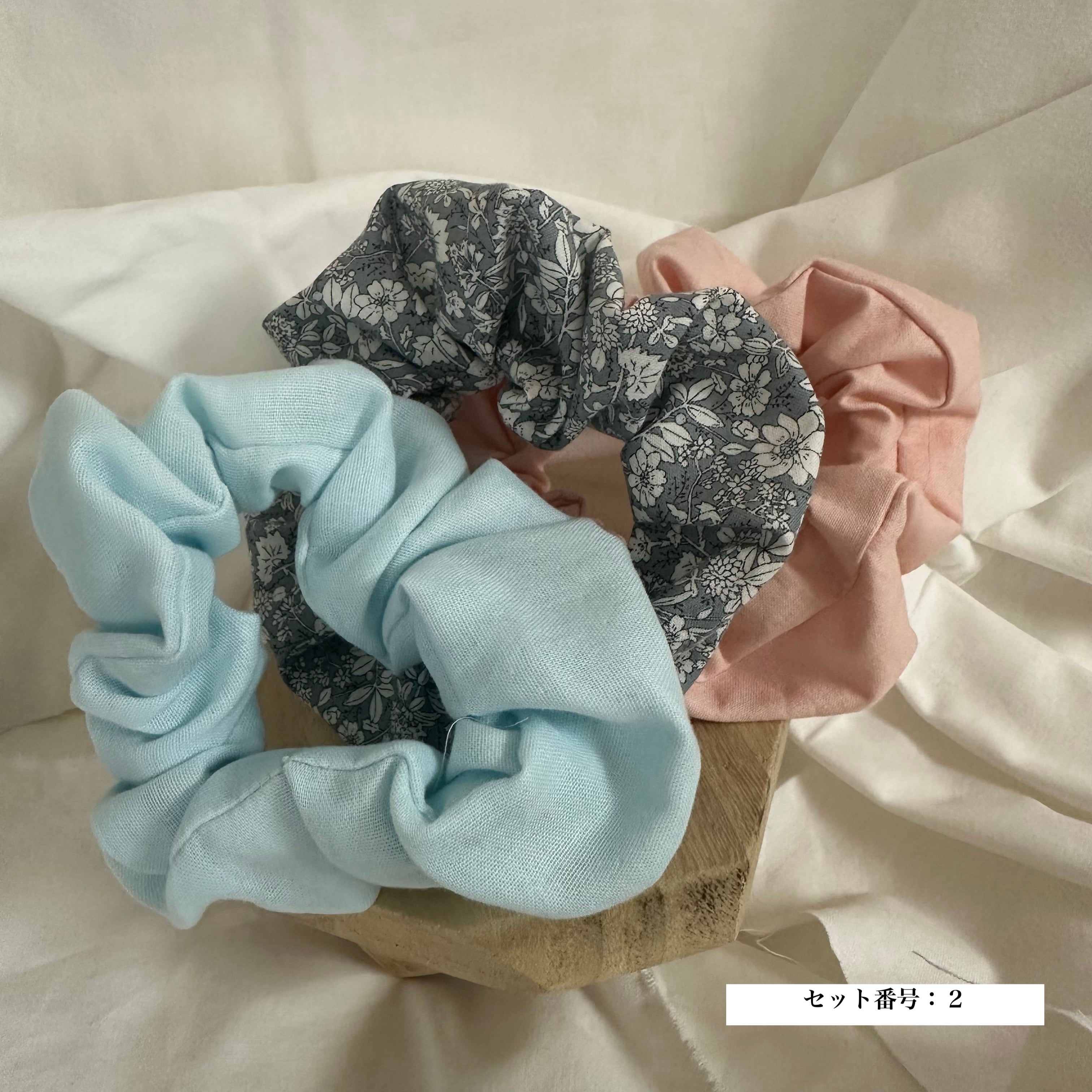異なる生地の風合いを楽しめるシュシュ3点セットです。